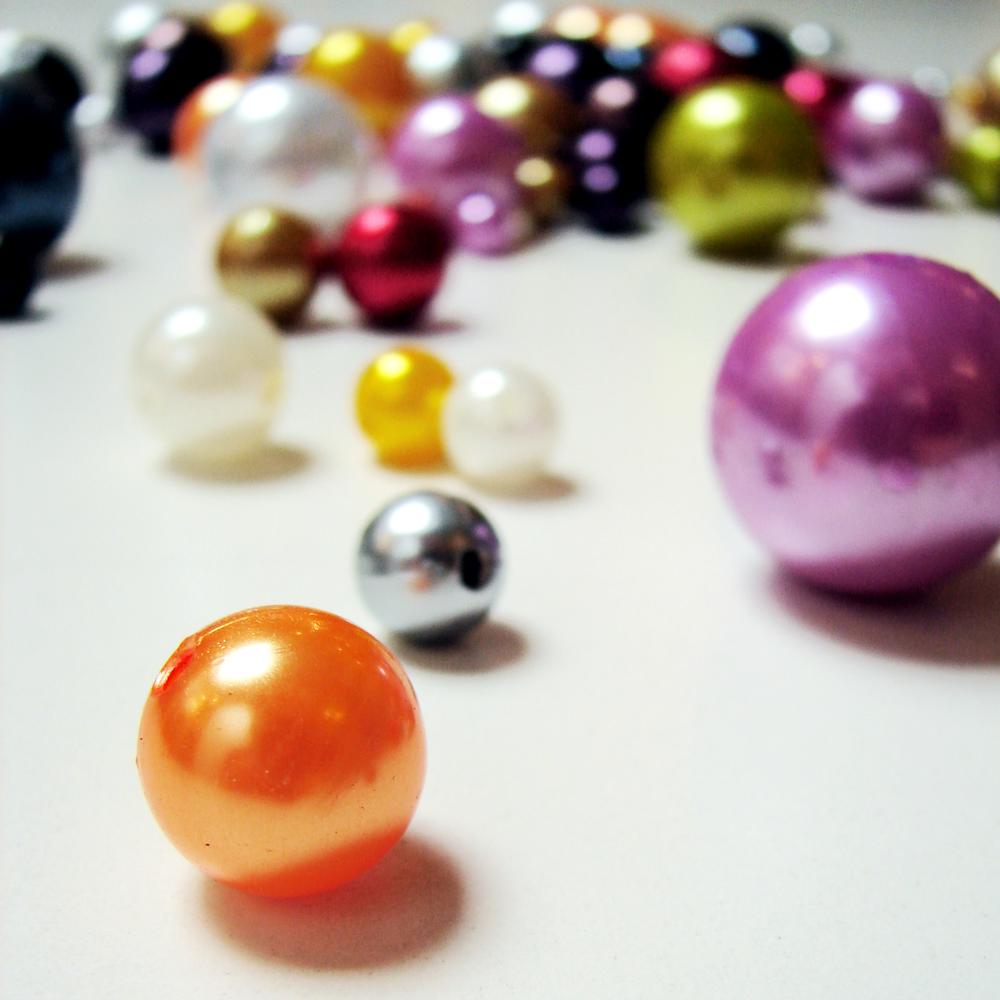 Dekorační umělohmotné navlékací perly, Ø 8 mm. V průhledné plastové krabičce na zavěšení.