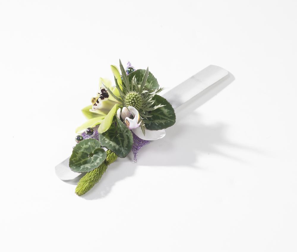 Nejdříve umístíme hlavní a nejtěžší květy (v tomto případě jsou to dvě velké růže), ty můžeme propíchnout drátem a připevnit k plastovým očkům, ovšem aby se drát nedotýkal kůže, podlepíme jej stuhou. Poté začneme drobnější květy a listy dolepovat floristickým lepidlem, nakonec přestříkáme přípravkem Finishing toutch.
